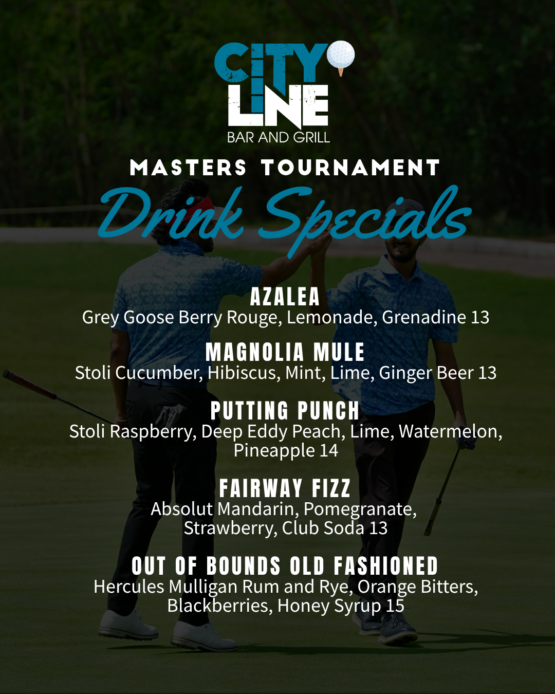 MASTERS TOURNAMENT SPECIALS Swing by for our Masters Week cocktail specials, available for a limited time only. Featuring fresh, fruity, and spirit-forward sips inspired by the tournament.